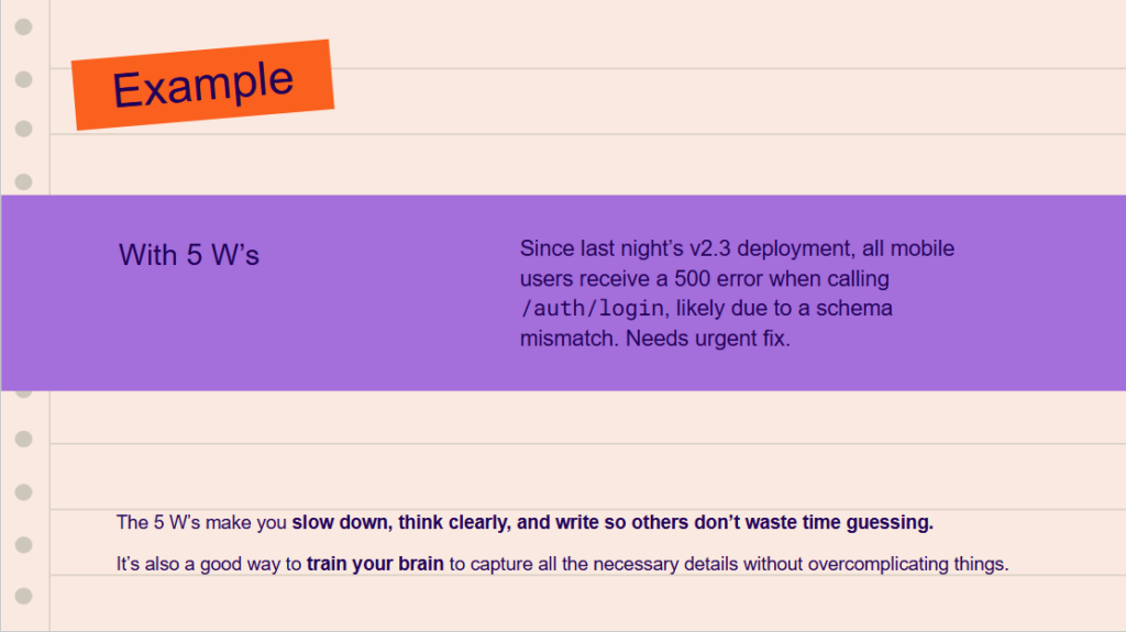 - Practice in small doses: Your next email, ticket description, or commit message is a chance to practice clear writing.